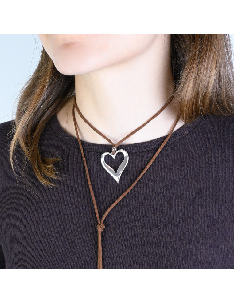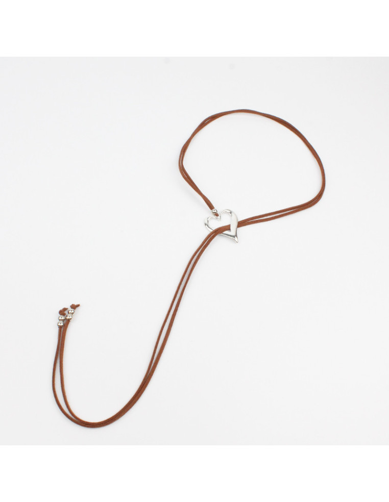 Collar Corbatero de gamuza de múltiples vueltas, con dije de fundición y terminales en punteras.Medida: 140cm de largo.