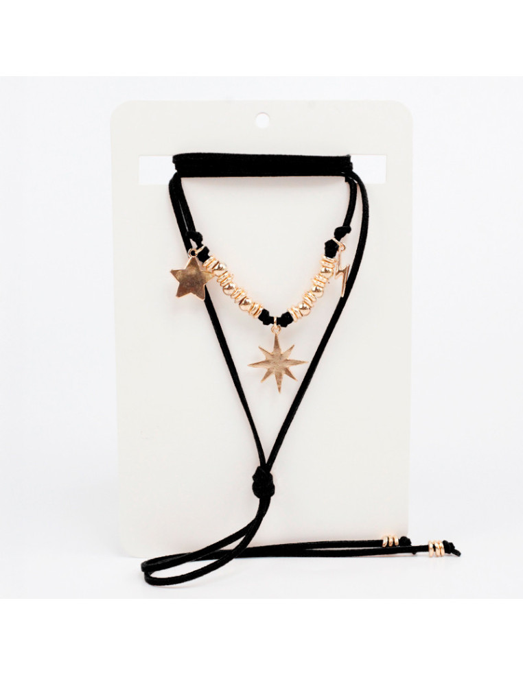 Collar de gamuza de múltiples vueltas, con dijes de fundición y terminales en punteras.Medida: 140cm de largo.