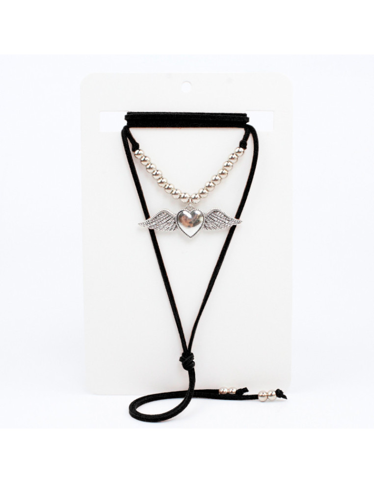 Collar de gamuza de múltiples vueltas, con dije de fundición con forma de corazón con alas y terminales en punteras. Medida: 140cm de largo.