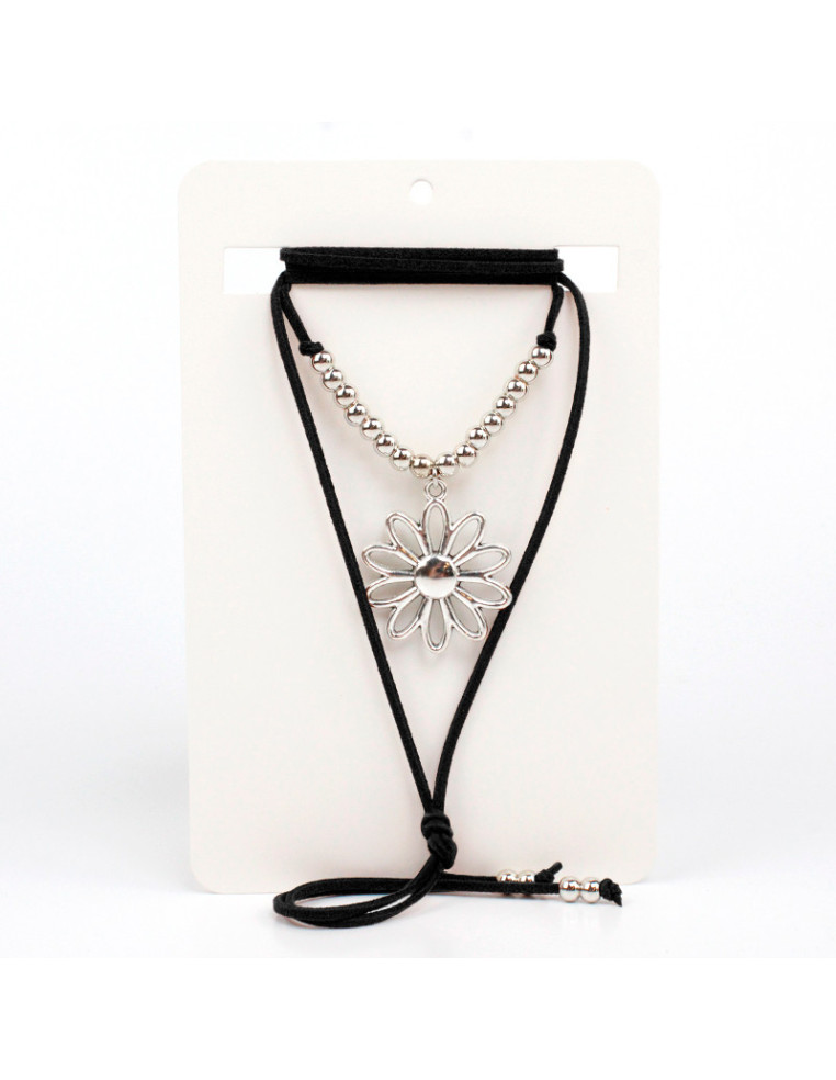 Collar de gamuza de múltiples vueltas, con dije de fundición con forma de margarita y terminales en punteras.