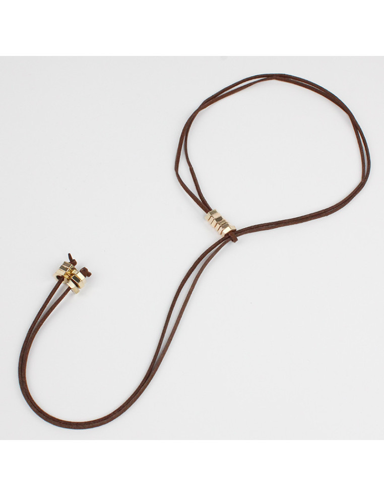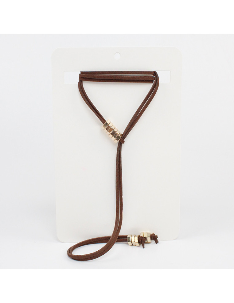 Collar de gamuza de múltiples vueltas, con pasantes de CCB y terminales en punteras. Medida: 140cm de largo.