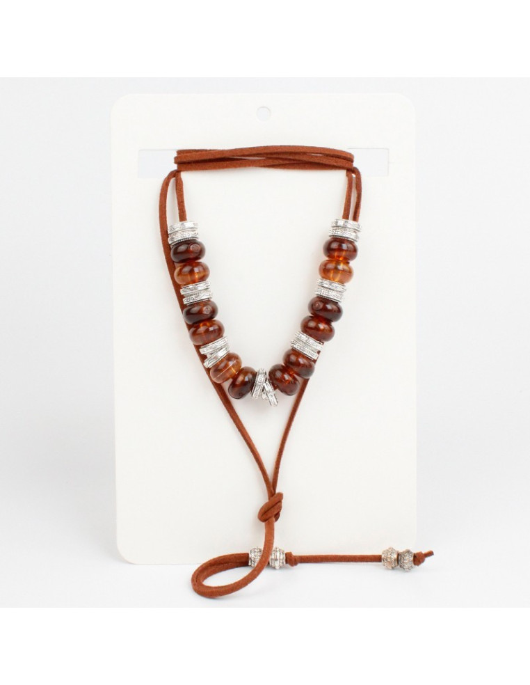 Collar combinado de gamuza de múltiples vueltas, con piezas de acrílico, pasantes de CCB dorados y terminales en punteras. Medida: 140cm de largo.