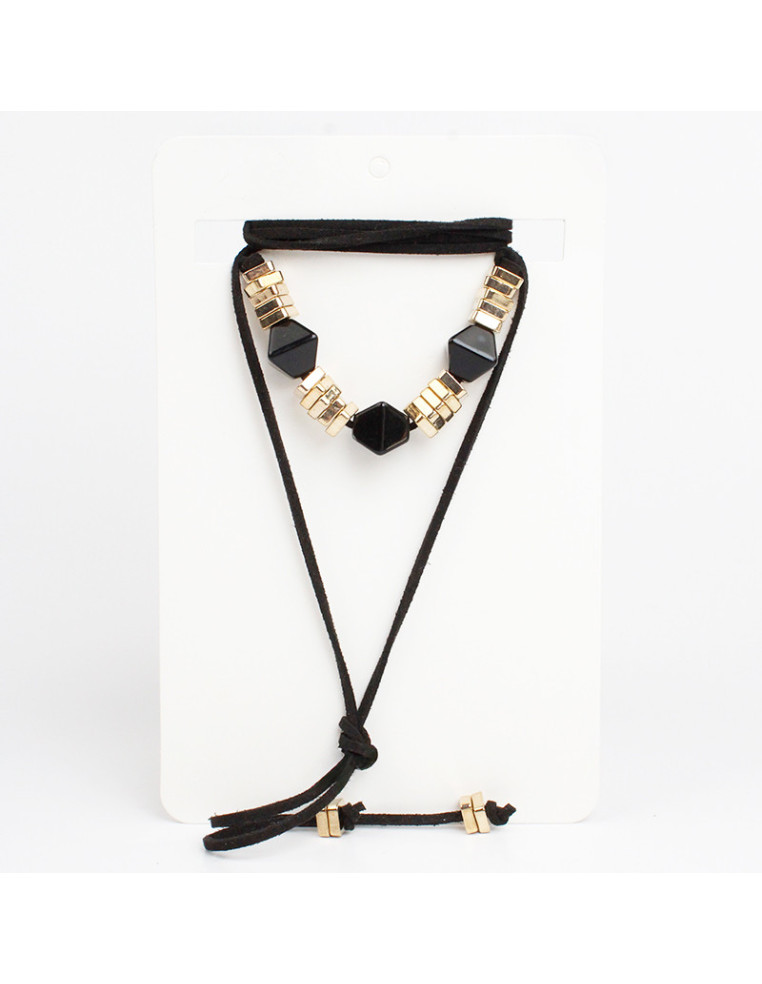 Collar de gamuza de múltiples vueltas, con pasantes de acrílico y CCB dorado, con terminales en punteras.Medida: 140cm de largo.
