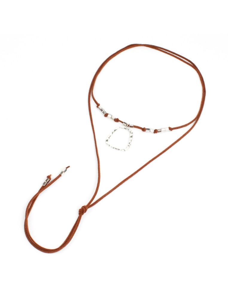 Collar de gamuza de múltiples vueltas, con dije de fundición texturizado y terminales en punteras.