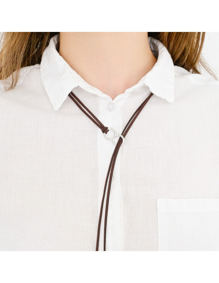 Collar corbatero de gamuza de múltiples vueltas, con pasante de CCB y terminales en punteras. Medida: 140cm de largo.