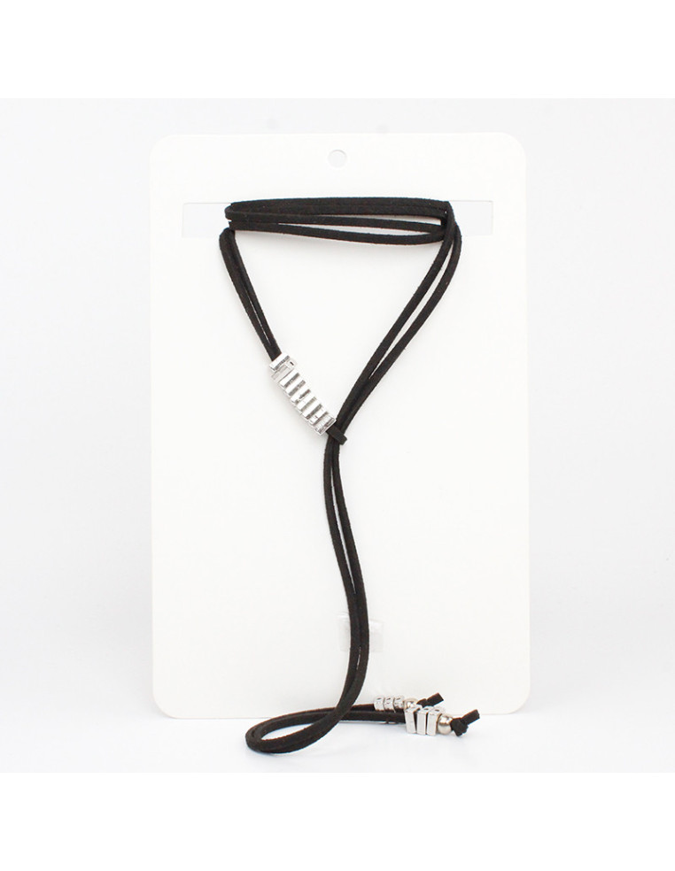 Collar corbatero de gamuza de múltiples vueltas, con pasantes de CCB y terminales en punteras. Medida: 140cm de largo.