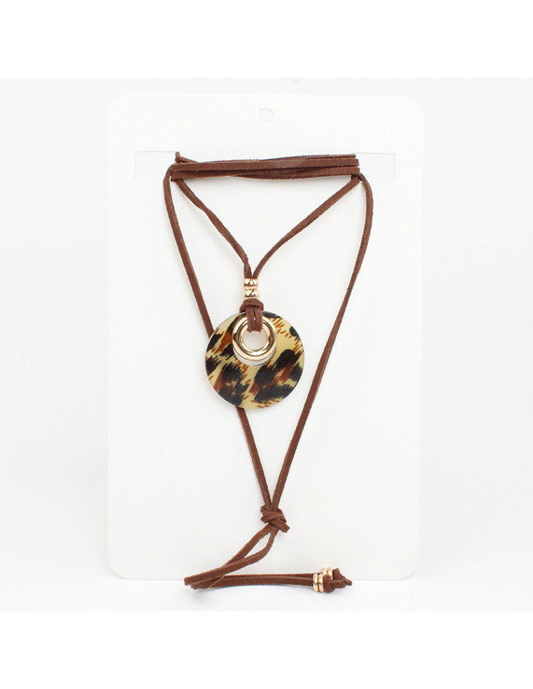 Collar de gamuza de múltiples vueltas, con dije de acrílico y terminales en punteras.