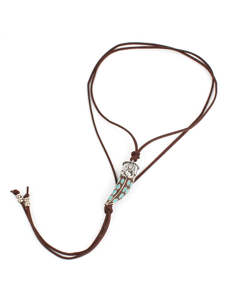 Collar de gamuza de múltiples vueltas, con dije de fundición Boho y terminales en punteras. Medida: 140cm de largo.