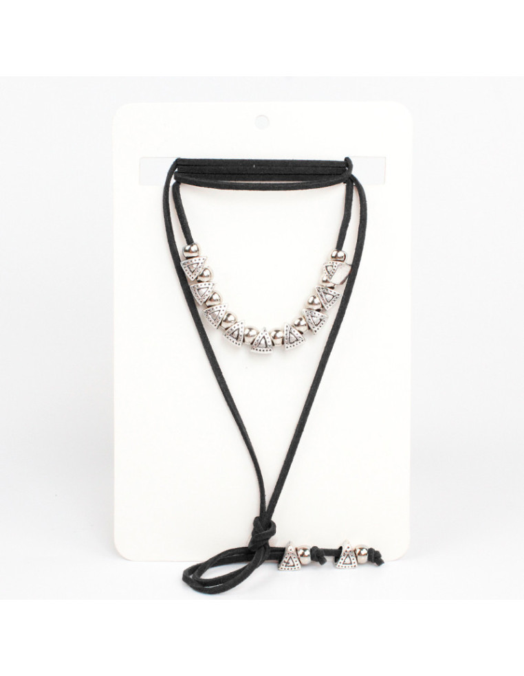 Collar de gamuza de múltiples vueltas, con pasantes de fundición y terminales en punteras. Medida: 140cm de largo.