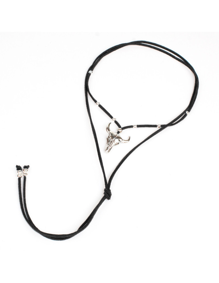 Collar de gamuza de múltiples vueltas, con dije de fundición boho y terminales en punteras. Medida: 140cm de largo.