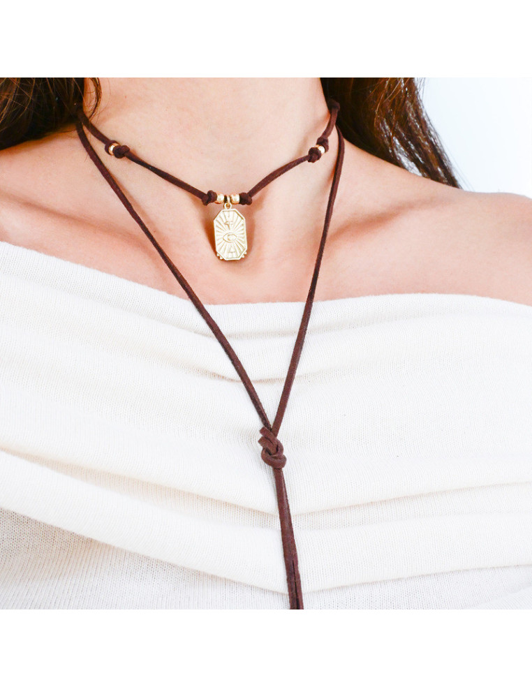 Collar de gamuza de múltiples vueltas, con dije de fundición dorado y terminales en punteras.