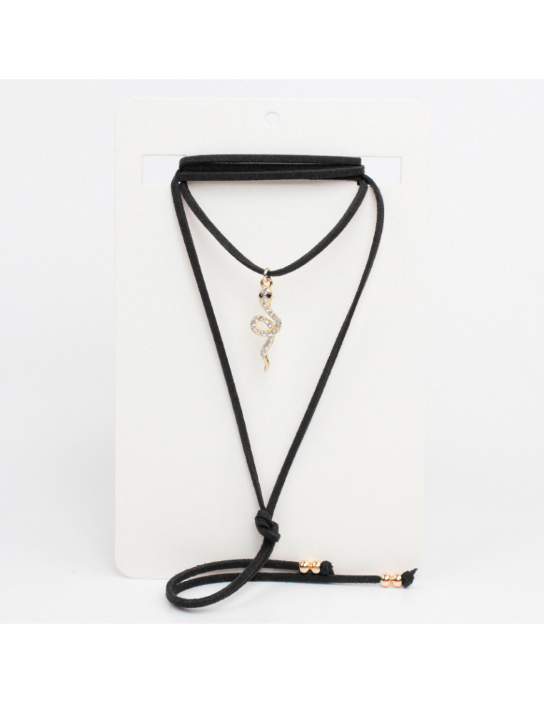 Collar de gamuza de múltiples vueltas, con dije de strass con forma de serpiente y terminales en punteras.