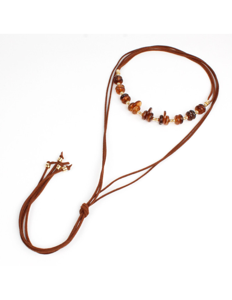 Collar combinado de gamuza de múltiples vueltas, con piezas de acrílico, pasantes de CCB dorados y terminales en punteras. Medida: 140cm de largo aproximado.