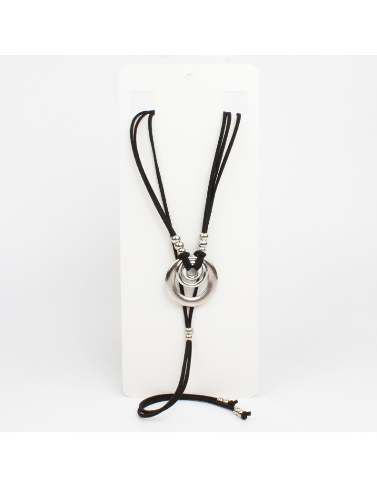 Collar corbatero de gamuzas con dijes de CCB circulares. Medidas: 36cm y 49cm de largo, ajustable con cadena de enganche de 10cm.