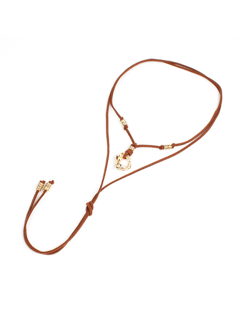 Collar de gamuza de múltiples vueltas, con dijes dorados, pasantes de CCB y terminales en punteras. Medida: 140cm de largo.