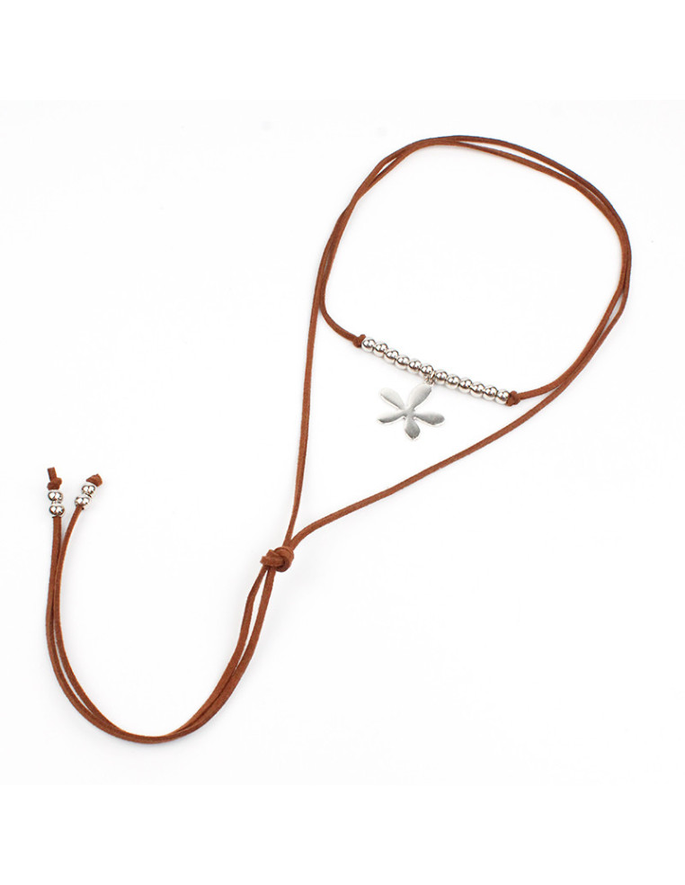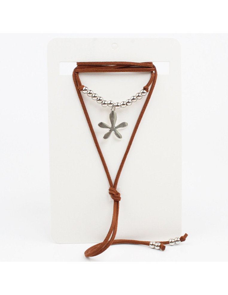 Collar de gamuza de múltiples vueltas, con dije de fundición con forma de flor y terminales en punteras. Medida: 140cm de largo.