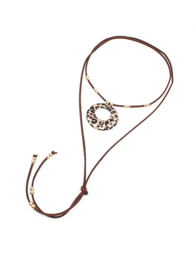 Collar de gamuza de múltiples vueltas, con dije animal print y terminales en punteras.
