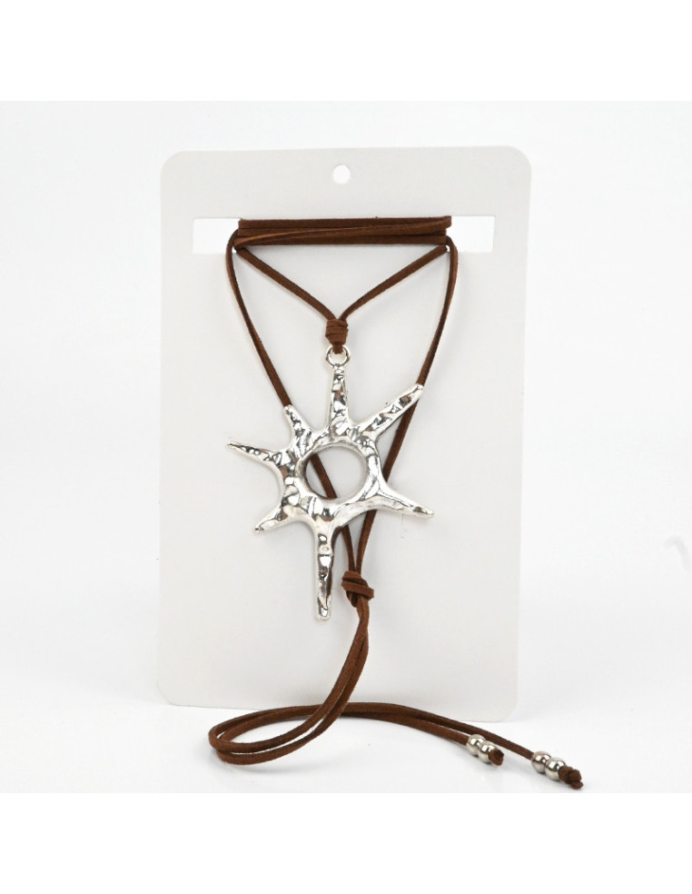 Collar de gamuza de múltiples vueltas, con dije exclusivo de fundición con forma de sol y terminales en punteras.