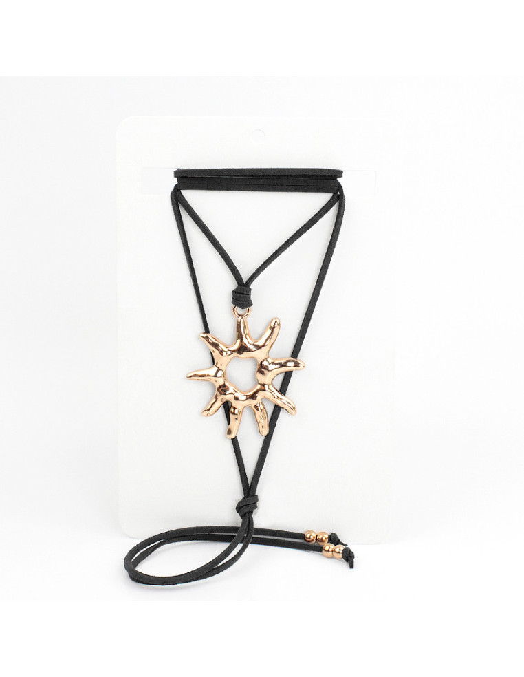 Collar de gamuza de múltiples vueltas, con dije exclusivo de fundición premium con forma de sol y terminales en punteras.Medida: 140cm de largo.