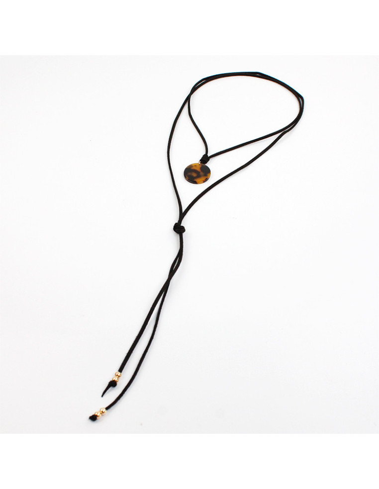 Collar de gamuza de múltiples vueltas, con dije de acrílico animal print y terminales en punteras.