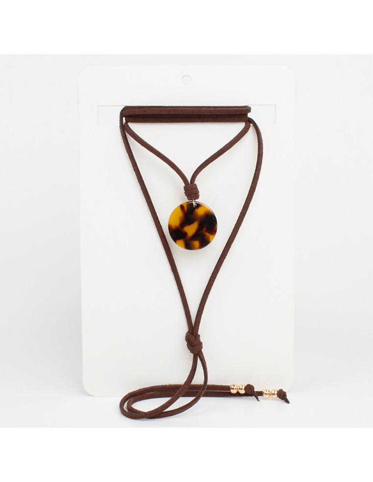 Collar de gamuza de múltiples vueltas, con dije de acrílico animal print y terminales en punteras.