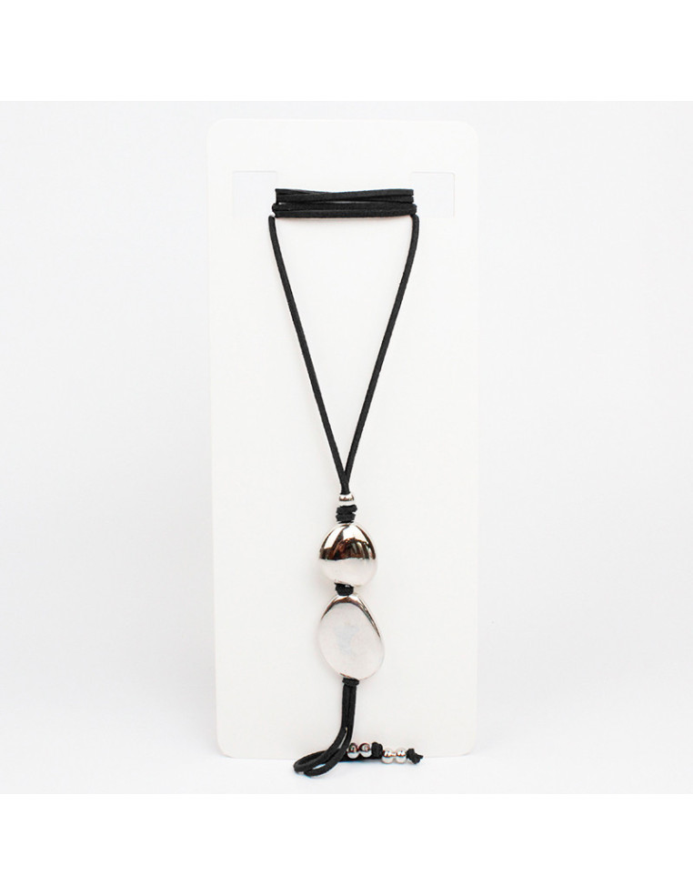 Collar corbatero de gamuza, con dijes pasantes orgánicos de CCB y terminales en punteras.