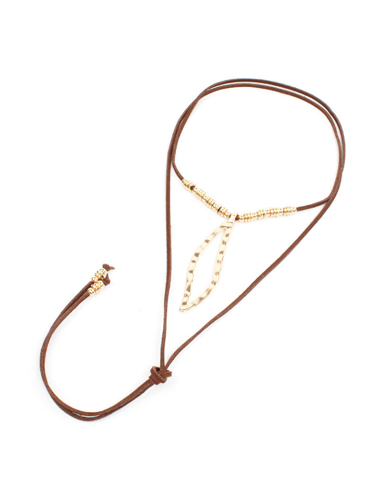 Collar de gamuza de múltiples vueltas, con dije de fundición dorado y terminales en punteras.