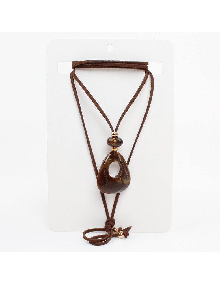 Collar de gamuza de múltiples vueltas, con dije de acrílico orgánico y terminales en punteras.