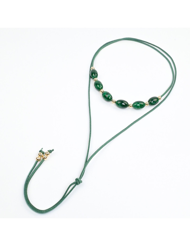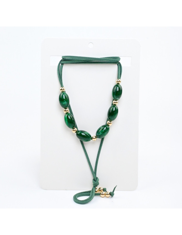 Collar de gamuza de múltiples vueltas, con cuentas de vidrio, pasantes de CCB y terminales en punteras.