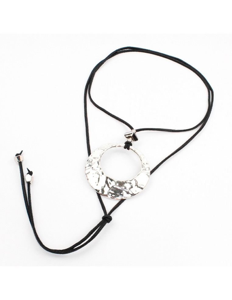Collar de gamuza de múltiples vueltas, con dije de fundición orgánico y terminales en punteras.Medida: 140cm de largo.