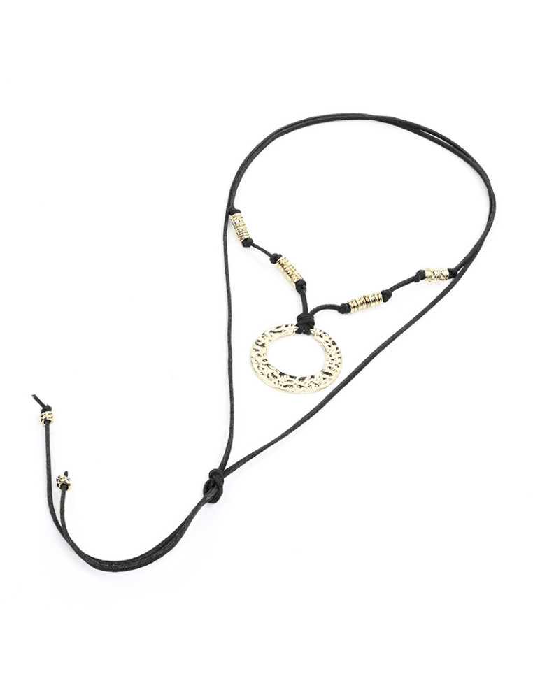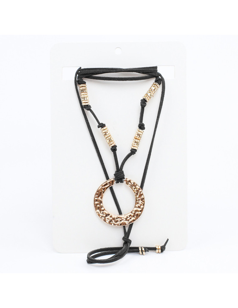 Collar de gamuza de múltiples vueltas, con dije de fundición dorado y terminales en punteras. Medida: 140cm de largo.