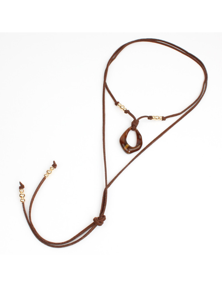 Collar de gamuza de múltiples vueltas intervenido con dije exclusivo de acrílico, bolitas de hierro pasantes y terminales en punteras.