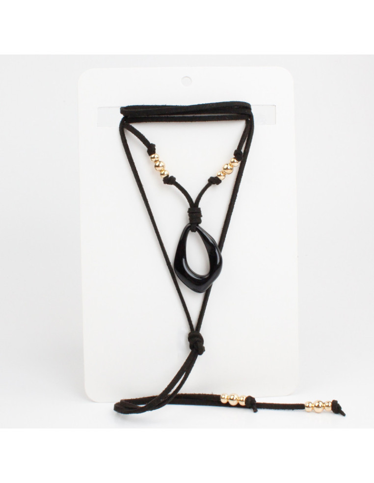 Collar de gamuza de múltiples vueltas intervenido con dije exclusivo de acrílico, bolitas de hierro pasantes y terminales en punteras.Medida del collar 160cm.