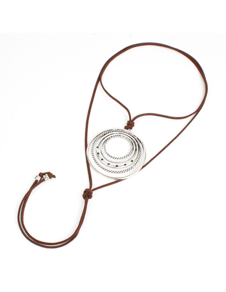 Collar de gamuza de múltiples vueltas, con dije geométrico y terminales en punteras. Medida: 140cm de largo.