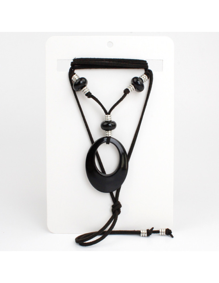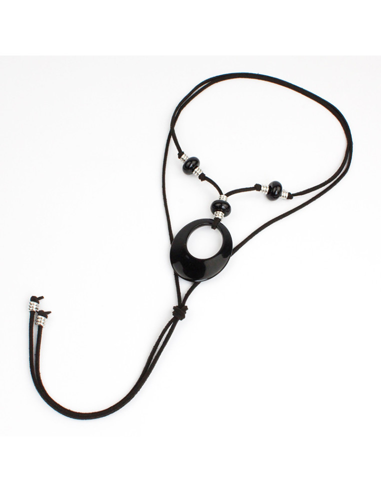 Collar de gamuza de múltiples vueltas, con piezas de acrílico y terminales en punteras. Medida: 140cm de largo.