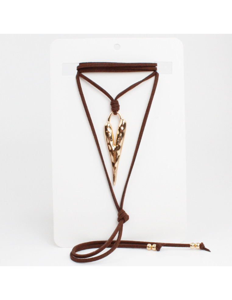 Collar de gamuza de múltiples vueltas, con dije forma de corazón y terminales en punteras. Medida: 140cm de largo.