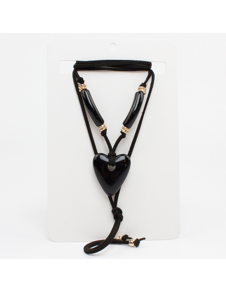 Collar de gamuza de múltiples vueltas, con dije de acrílico con forma de corazón, pasantes de acrílico marmolados y terminales en punteras. Medida: 140cm de largo.