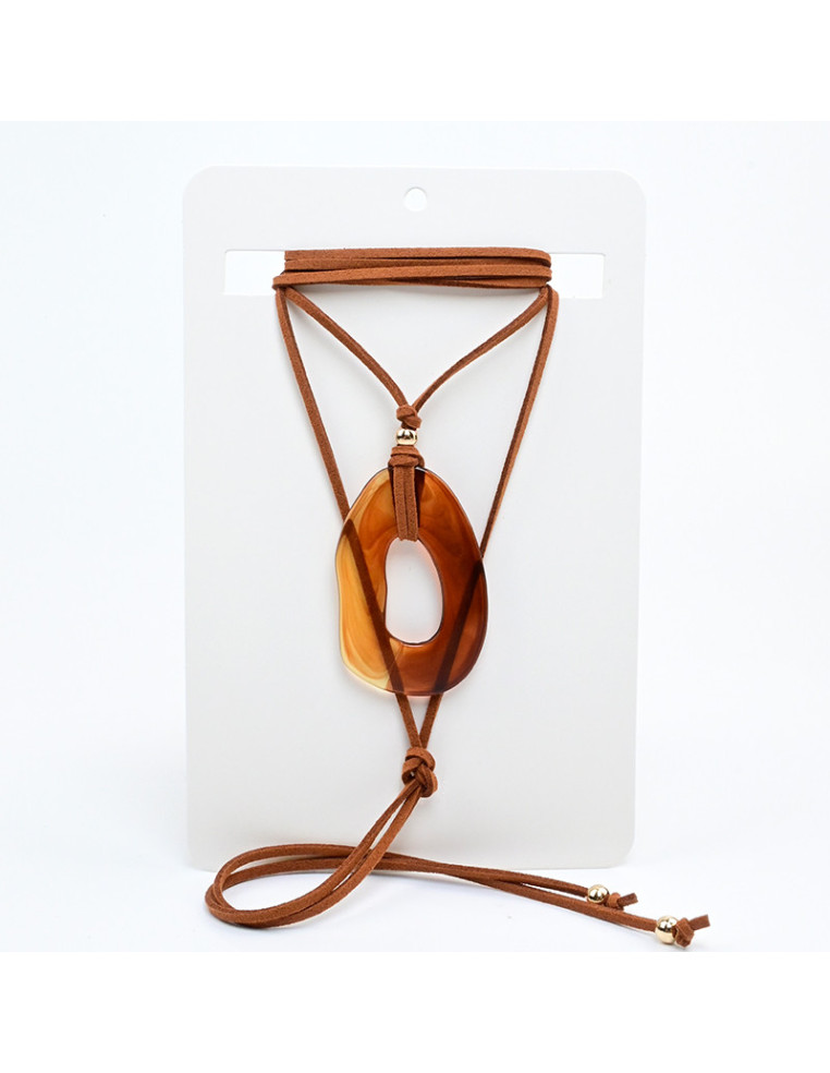 Collar de gamuza de múltiples vueltas, con dije de acrílico exclusivo y terminales en punteras.