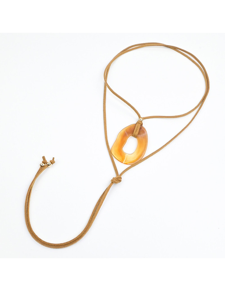 Collar de gamuza de múltiples vueltas, con dije de acrílico exclusivo y terminales en punteras.