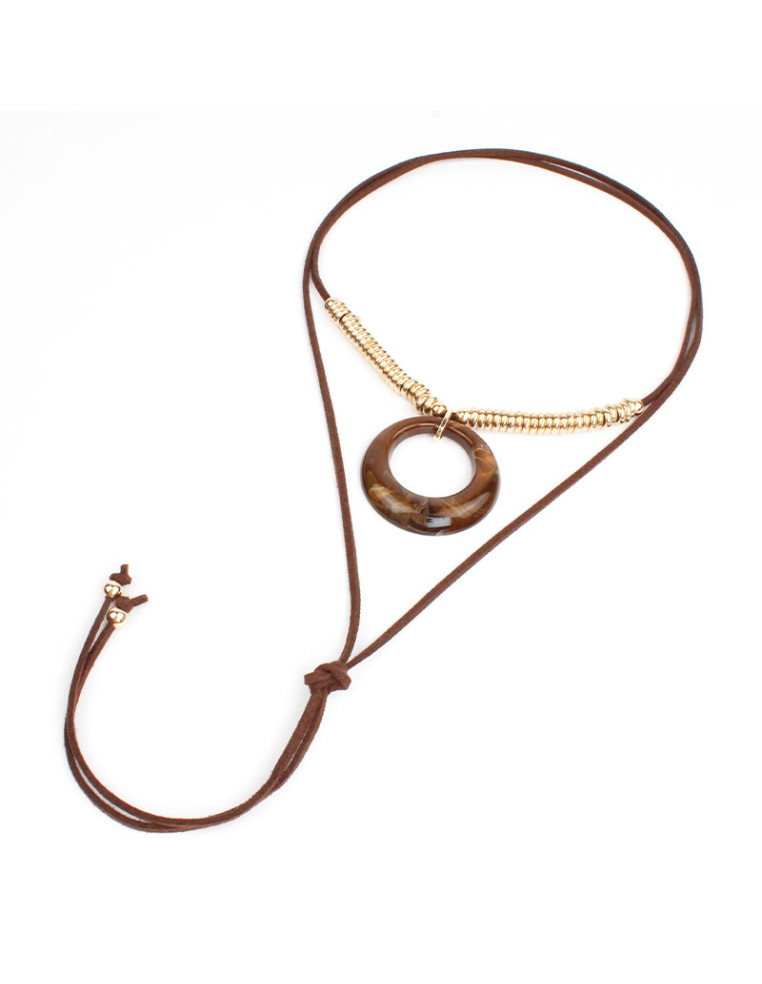 Collar de gamuza de múltiples vueltas, con dije de acrílico y terminales en punteras.