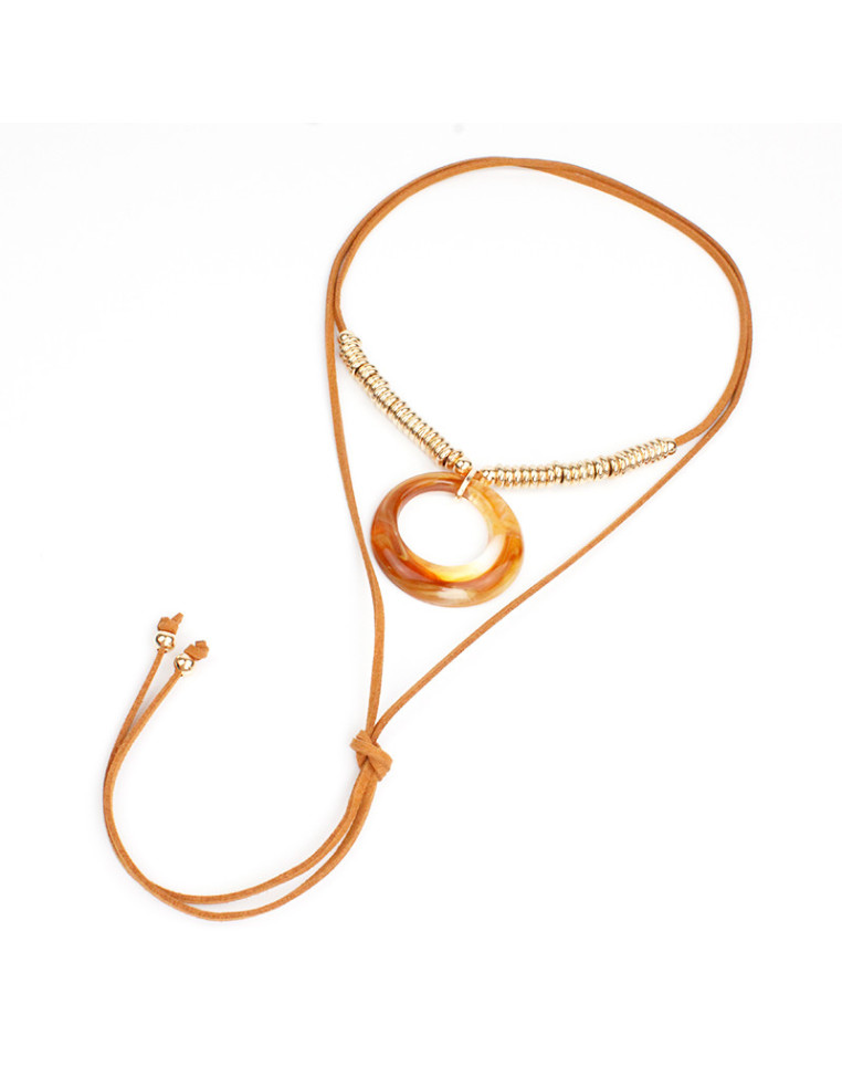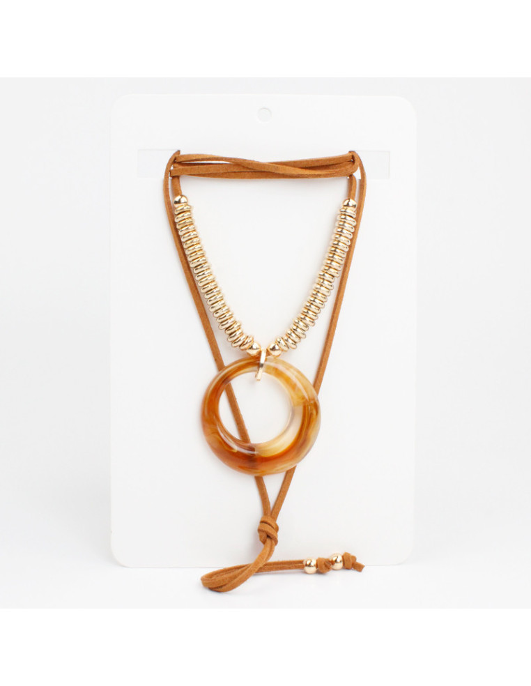 Collar de gamuza de múltiples vueltas, con dije de acrílico y terminales en punteras.