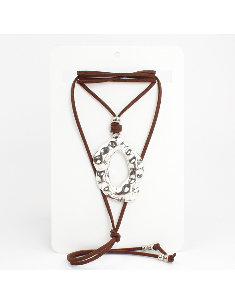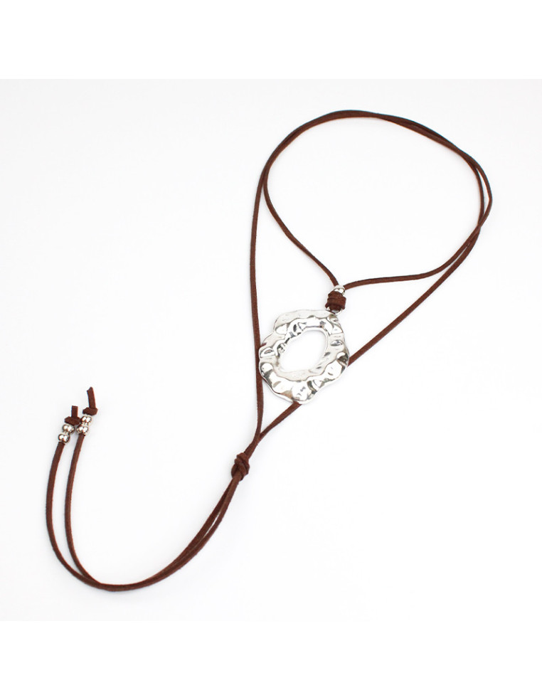 Collar de gamuza de múltiples vueltas, con dije de fundición orgánico y terminales en punteras.