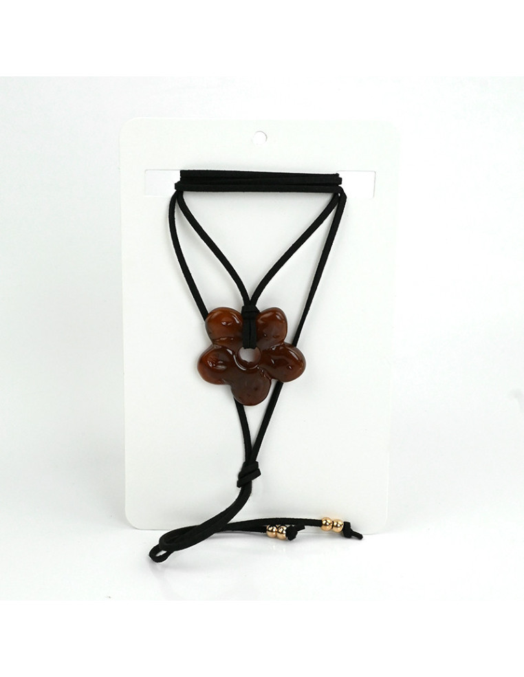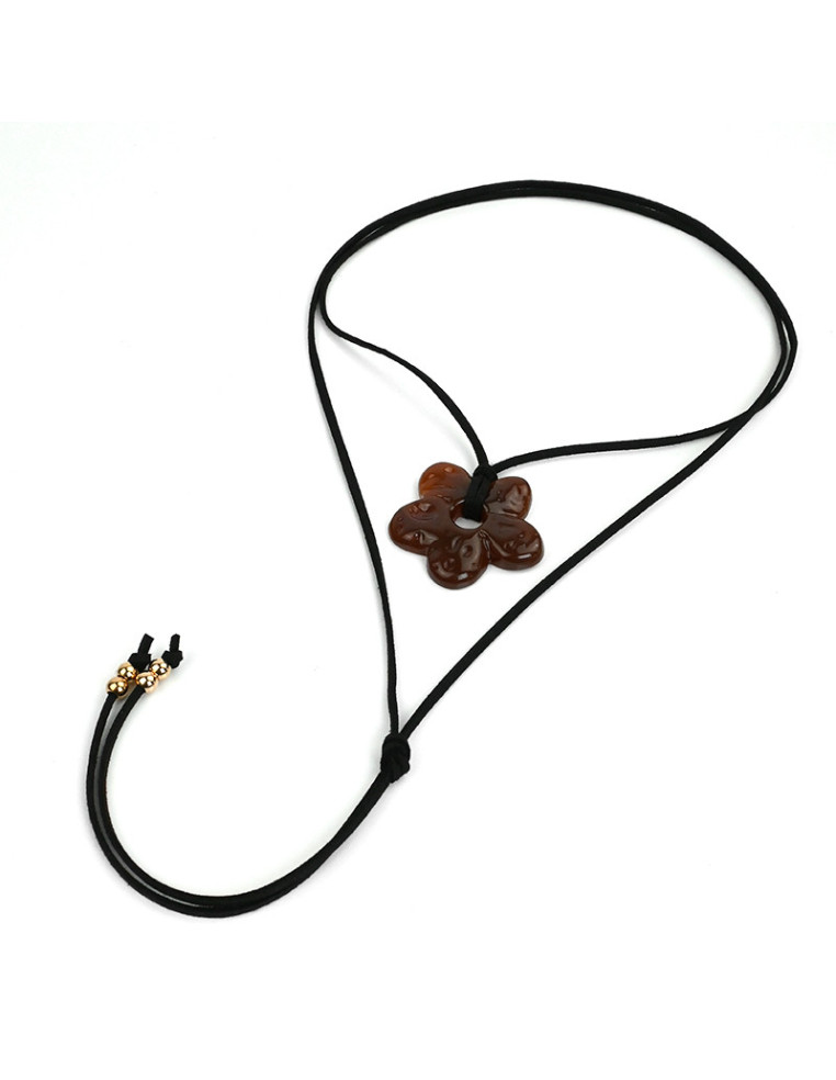 Collar de gamuza de múltiples vueltas, con dije exclusivo de acrílico con forma de flor y terminales en punteras.