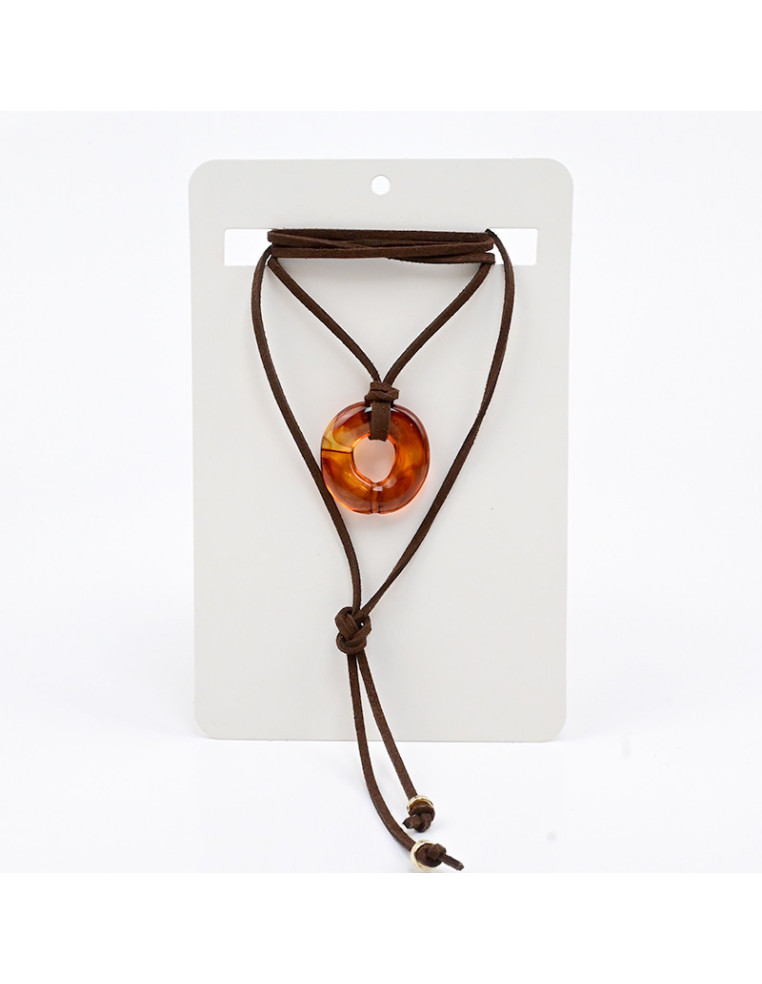 Collar de gamuza de múltiples vueltas, con dije orgánico de acrílico y terminales en punteras.Medida: 140cm de largo.