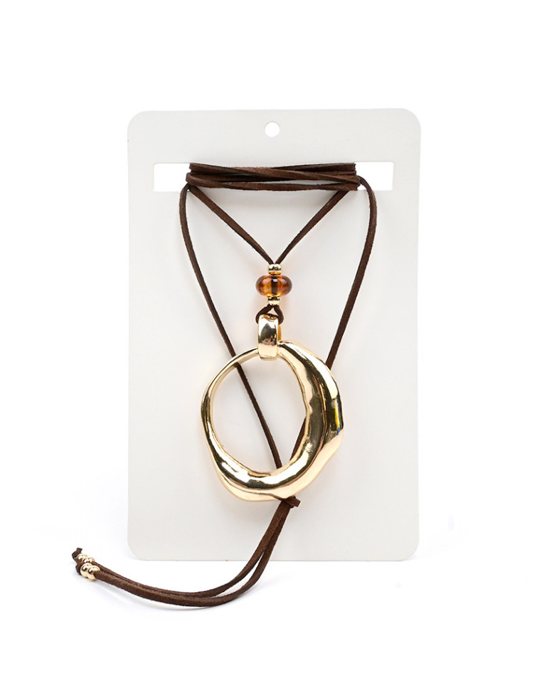 Collar de gamuza de múltiples vueltas, con dije de fundición orgánico, piezas de acrílico y terminales en punteras.