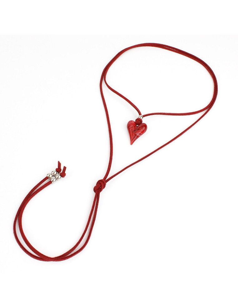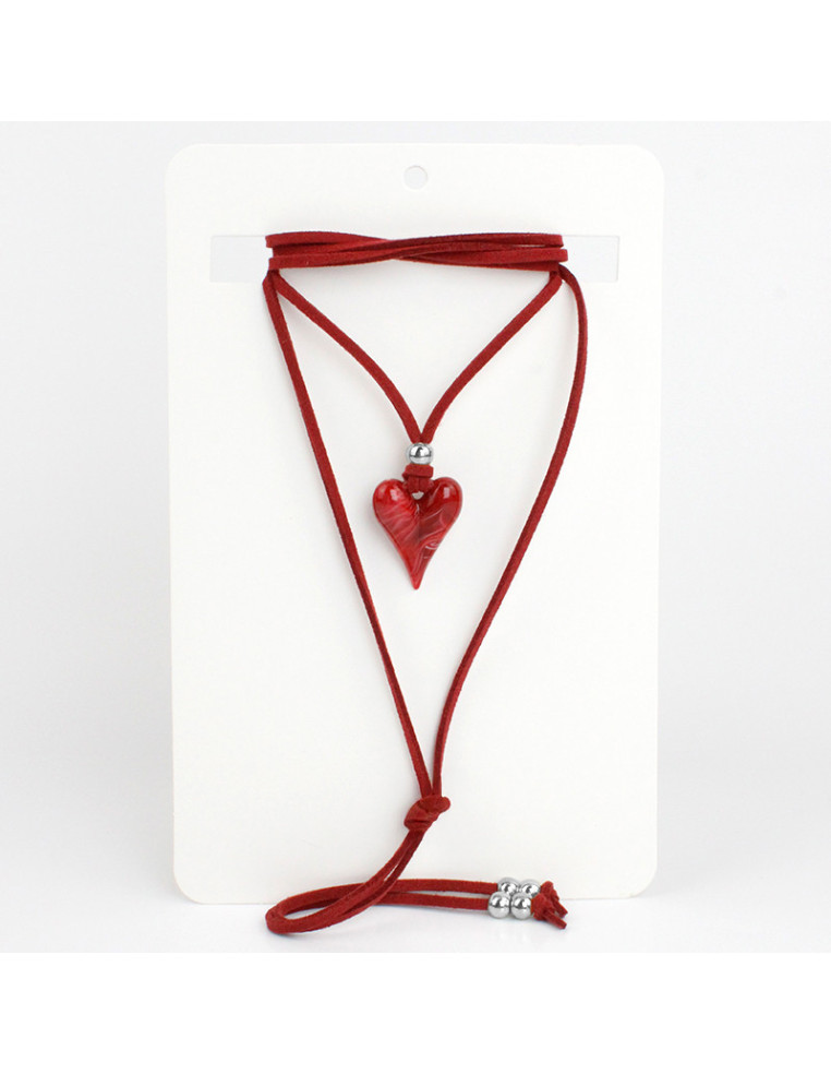 Collar de gamuza de múltiples vueltas, con dije de acrílico con forma de corazón y terminales en punteras. Medida: 140cm de largo.