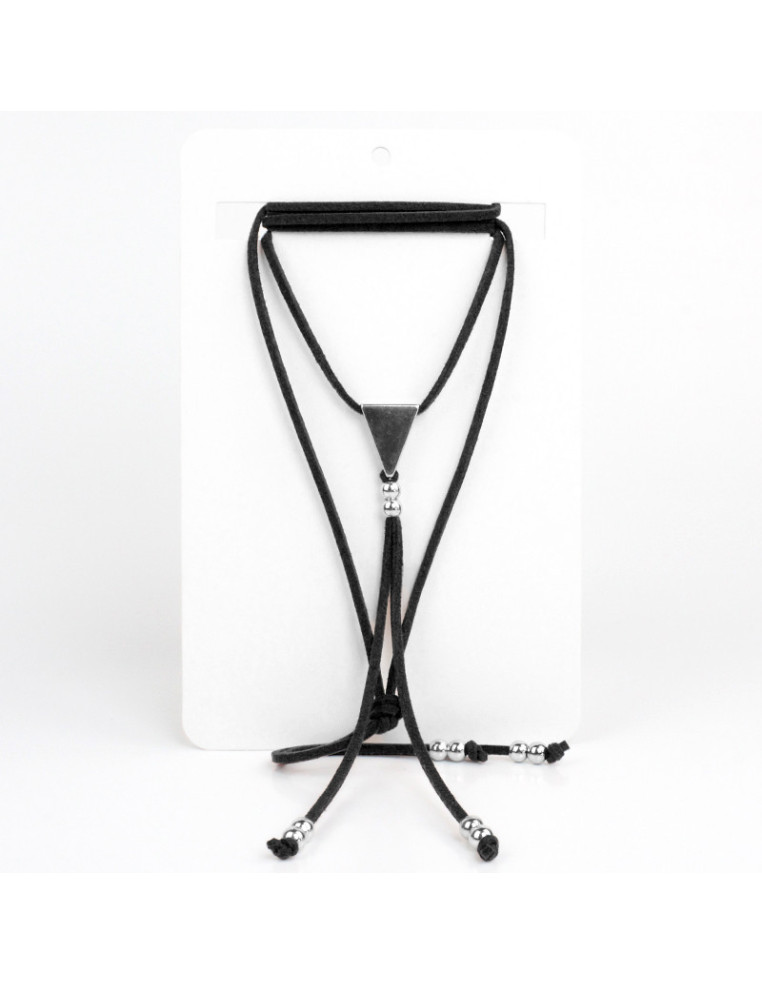 Collar corbatero de gamuza de múltiples vueltas, con dije de fundición, caída adicional de gamuza y terminales en punteras.