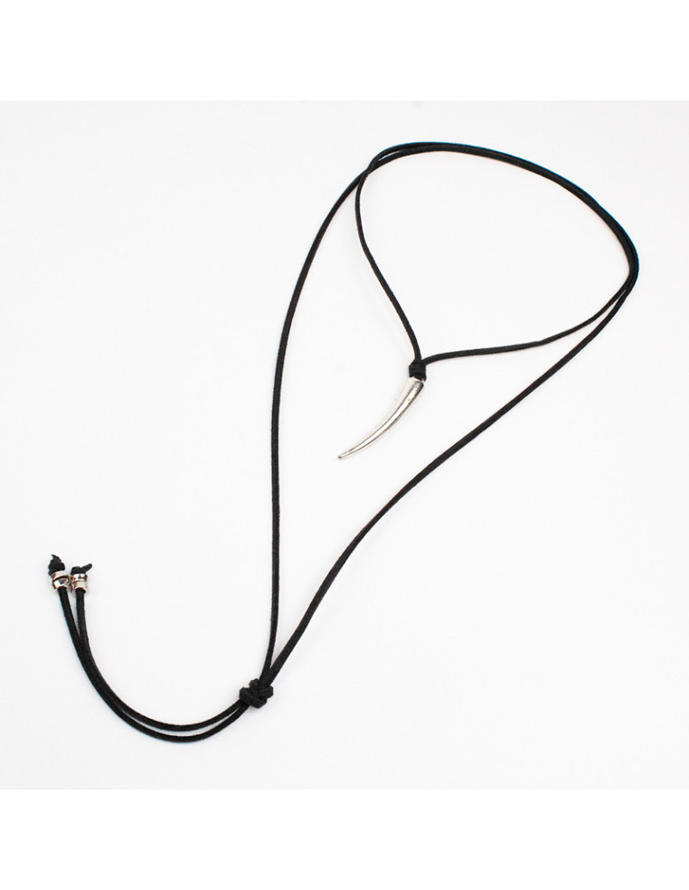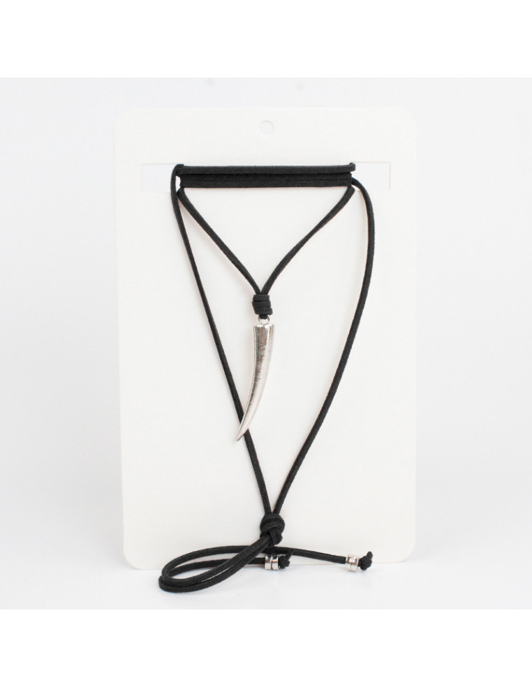 Collar de gamuza de múltiples vueltas, con dije de fundición con forma de colmillo y terminales en punteras.