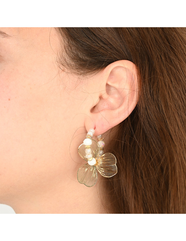 Aro trendy de argollas con piezas exclusivas de metal con forma de pétalos de flor calada combinados con rocas de cristal.