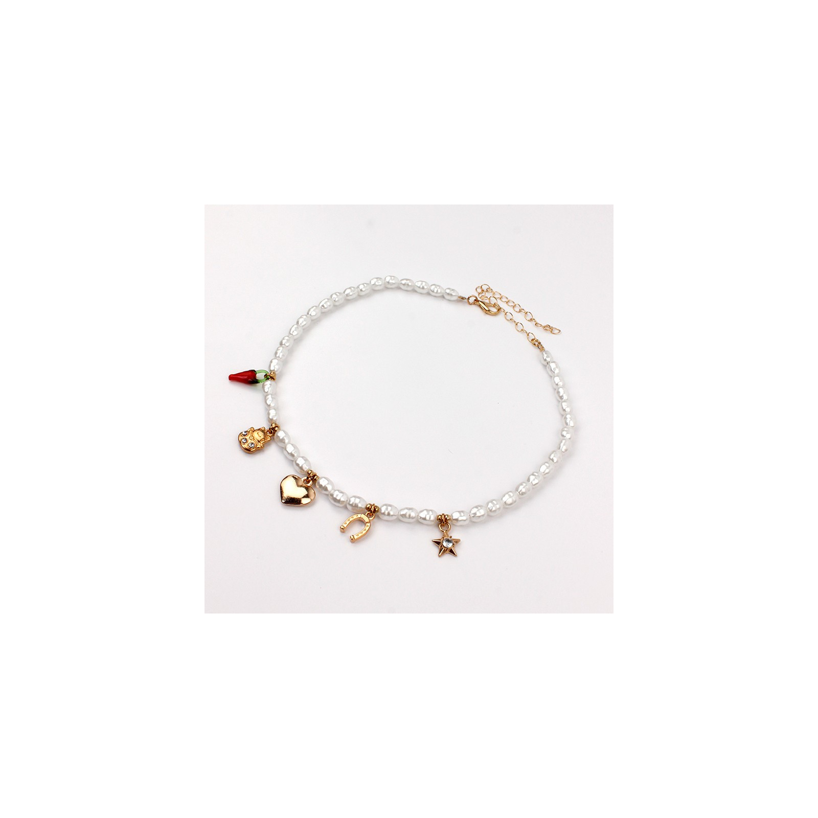 Collar de símil perlas de río con múltiples dijes exclusivos dorados.